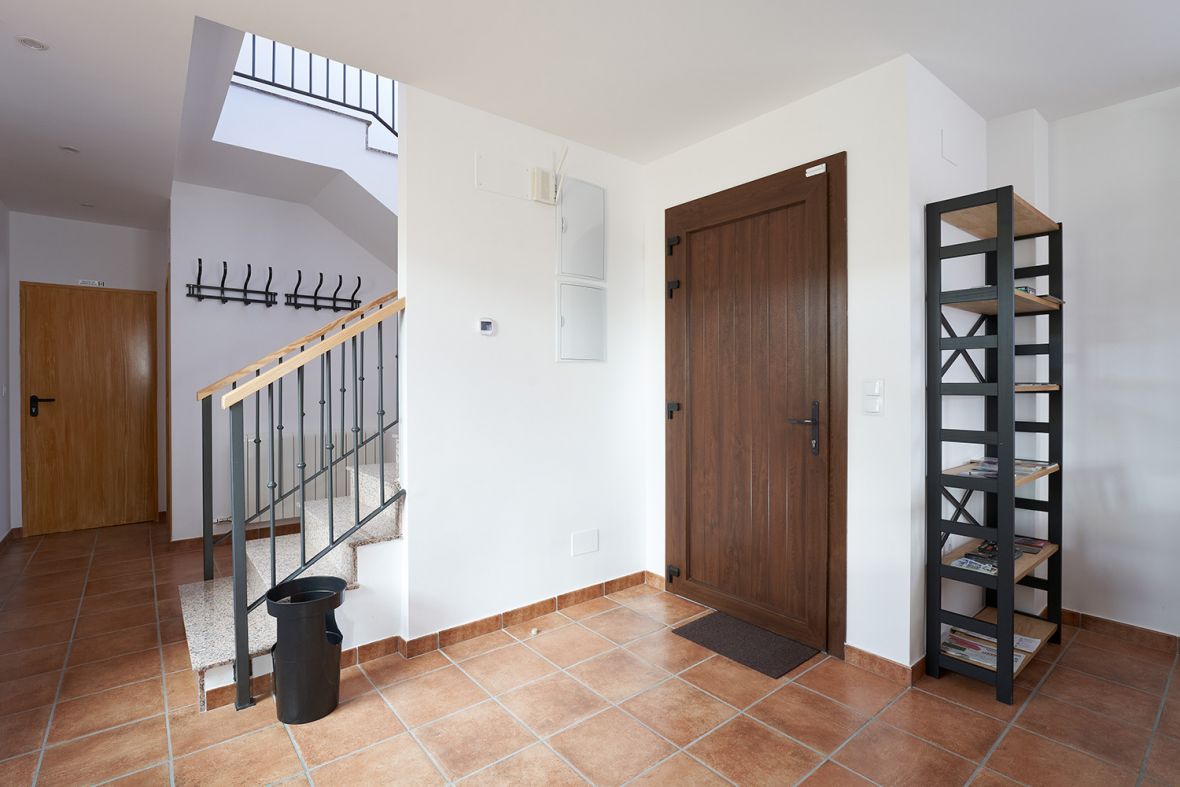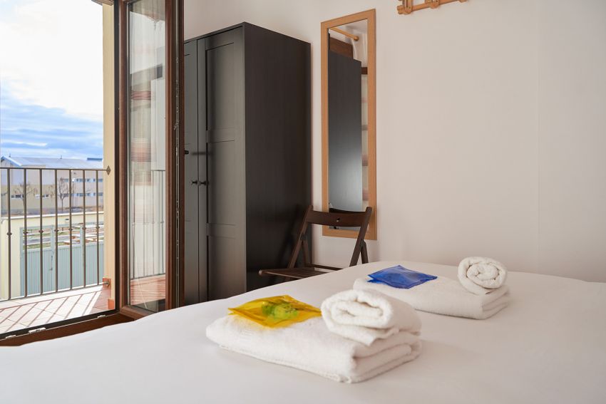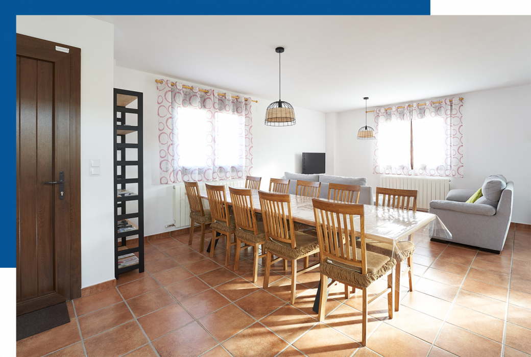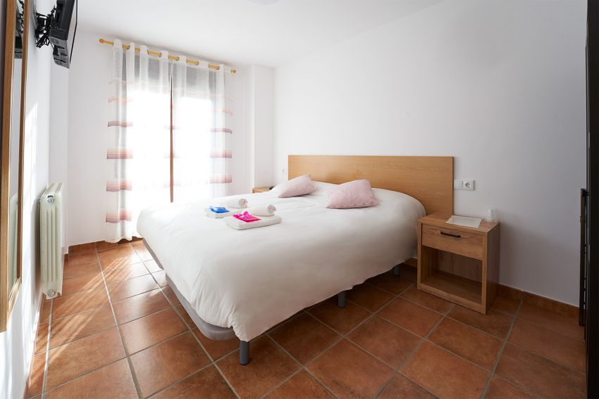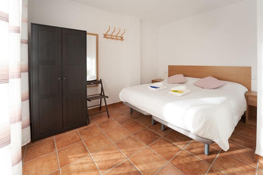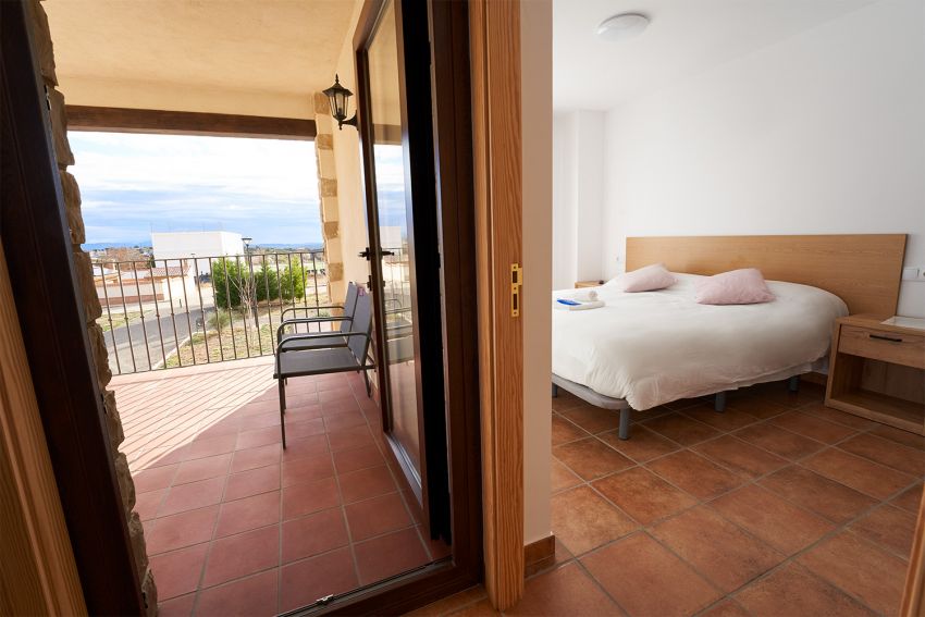 Nuestra casa rural ofrece 5 habitaciones dobles, 1 en la planta baja y 4 en la primera planta. Cada una está equipada con armario, mesitas, espejo, perchero, 2 sillas y TV. La habitación de la planta baja, con un ventanal al patio interior, es accesible para personas con movilidad reducida y cuenta con una cama doble de 1.50x2m. Las habitaciones de la primera planta tienen balconeras con vistas a la sierra Gúdar-Javalambre, con cuatro camas de 1.80x2m, que pueden convertirse en ocho camas individuales de 0.90x2m y dos camas supletorias para niños.