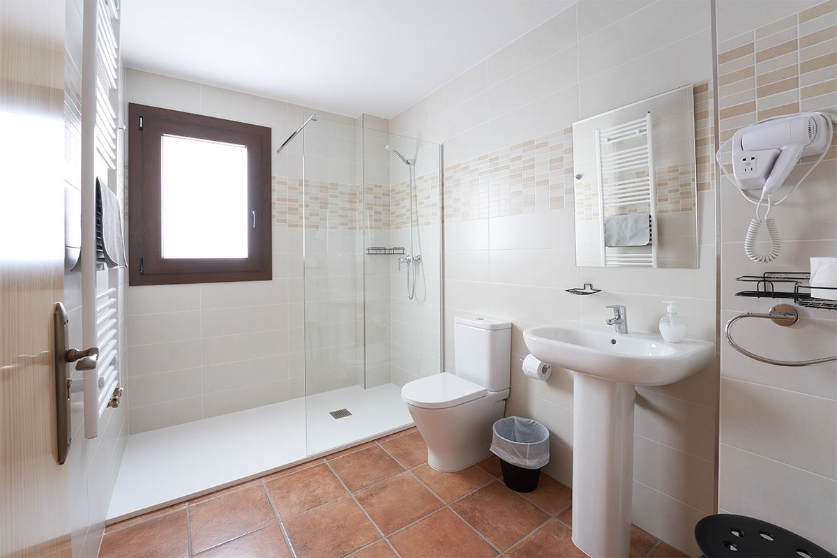 La casa dispone de 3 baños, 1 en la planta baja y 2 en la 1ª planta. Los 3 equipados con percheros para toallas, toallero radiante y secador. Además el baño de la planta baja está adaptado para personas de movilidad con barras de agarre y silla para ducha.